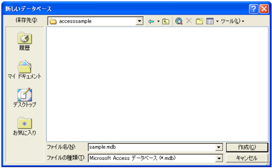 Accessではまずデータベースを作成した時にデータベースの保存先とデーターベースファイル名を指定する必要があります。今回は「C:¥accesssample」ディレクトリ内に「sample.mdb」と言う名前でデータベースファイルを作成します。