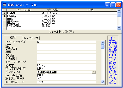 今回は「顧客名」フィールドにインデックスを設定してみます。「顧客名」フィールドをクリックして下さい。