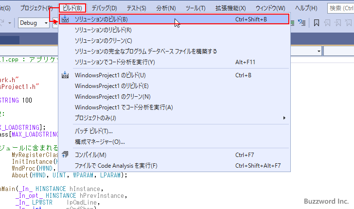 先ほど作成したプロジェクトはまだテンプレートだけにものですが、ビルドして実行することができます。「ビルド」メニューの中の「ソリューションのビルド」をクリックしてください。