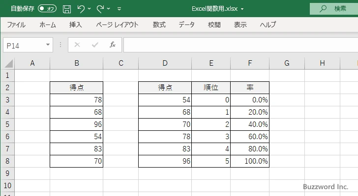 順位をデータの数から 1 を引いた値で割った値を計算します(パーセンテージで表示するように表示形式を設定しています)。最初のデータは 0% 、最後のデータは 100% となります。