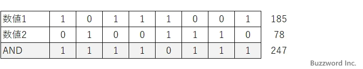 1 番目の引数が 185 (二進数で 10111001 ) で 2 番目の引数が 78 (二進数で 1001110 ) だった場合、 XOR を取得すると 247 (二進数で 11110111 ) となります。