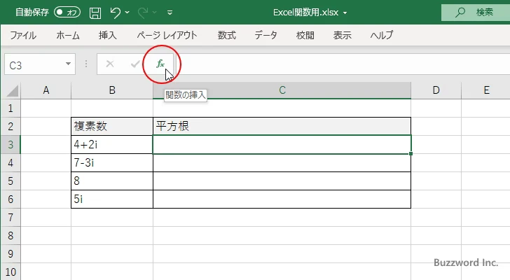 IMSQRT 関数を入力する場合に関数の挿入を使って行う方法を試してみます。関数を挿入するセルをクリックして選択したあとで、関数の挿入をクリックします。