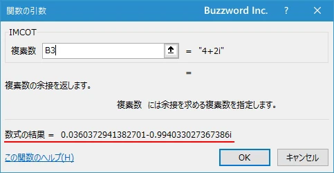 最初に選択したセルに IMCOT 関数が入力され、引数に指定した複素数のコタンジェントを取得した結果がセルに表示されます。