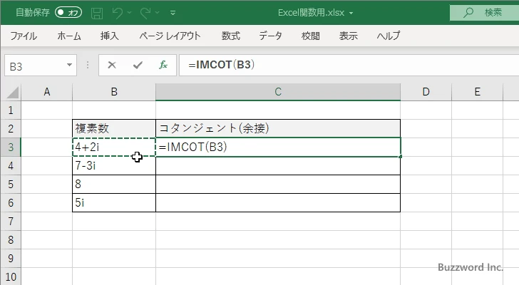 取得したコタンジェントを表示する C3 セルを選択し、次のように入力しました。引数に対象の複素数が入力されている B3 セルを指定しています。