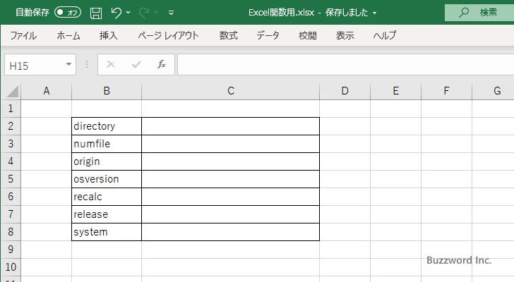 それでは実際に INFO 関数を使ってみます。 Excel のシートに対象の数値を次のように入力しました。