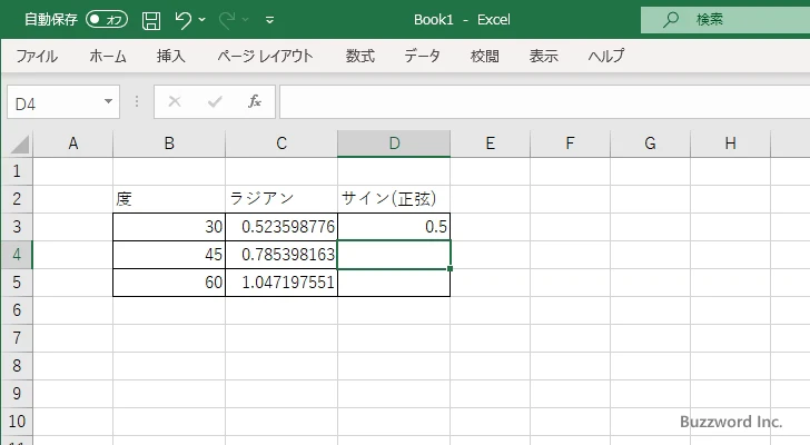 結果を表示する D3 セルに次のように SIN 関数を入力します。引数にラジアン単位の角度が入力されたセルを指定します。