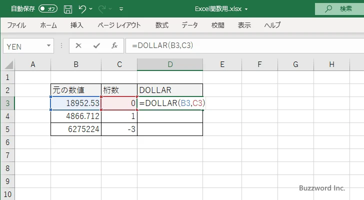 取得した文字列を表示する D3 セルを選択し、次のように入力しました。 DOLLAR 関数の 1 番目の引数には対象の数値として B3 セルを指定しました。 2 番目の引数には四捨五入を行う桁数として C3 セルを指定しました。