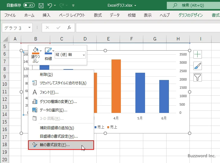 グラフの左側に表示される軸の上から 2 つの目盛ラベルの値を、第 2 軸で表示していた値に変更します。グラフの左側にある軸にマウスを合わせ、軸を右クリックして表示されたメニューの中から「軸の書式設定」をクリックして下さい。
