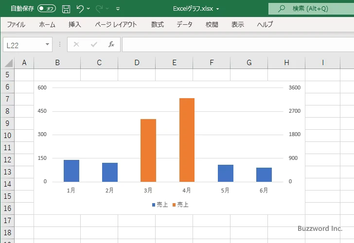 値が大きい 3 月と 4 月の系列が使用する軸が第 2 軸(グラフの右側に表示されている軸)に設定されました。