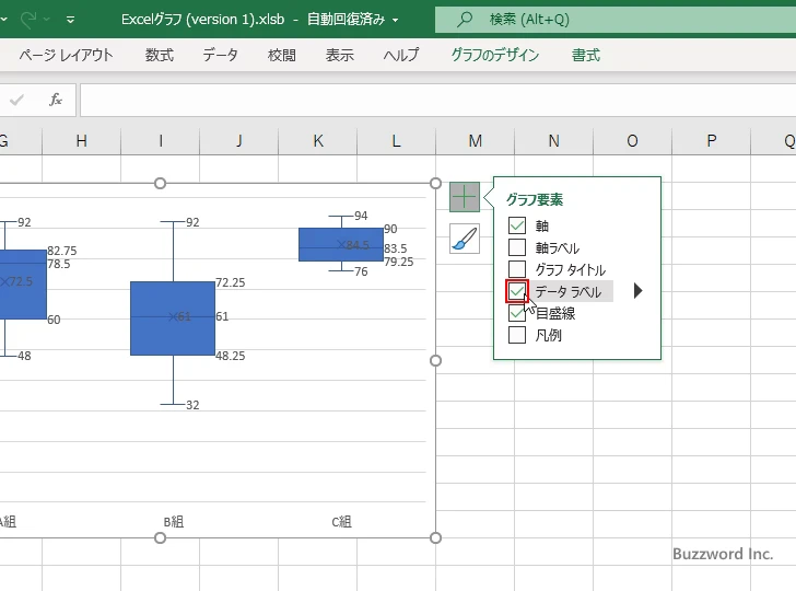 箱ひげ図には軸やタイトル、凡例、データラベル、などのグラフ要素を表示することができます。それぞれのグラフ要素を表示するかどうかを切り替えるには、最初に箱ひげ図を一度クリックしてください。
