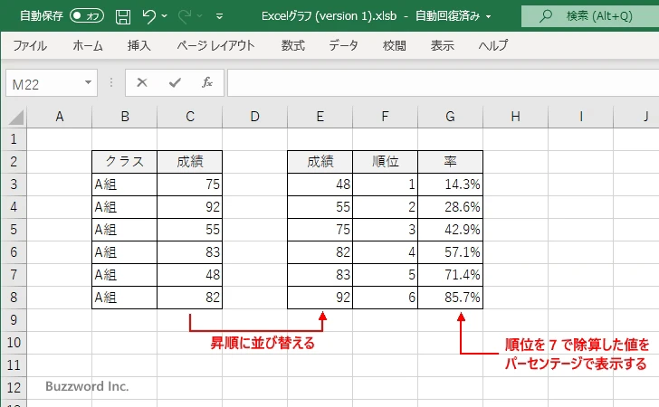 なおこのページの最初の方で「包括的な中央値」を選択している場合の具体的な算出方法を記載しましたが、「排他的な中央値」を選択している場合は少し算出方法が異なります。同じ 6 つのデータを対象にした場合、先頭から 1 から始まる順位を付けます。そして順位をを項目の数に 1 を加えた値(今回の場合は 6 + 1 = 7)で除算します。