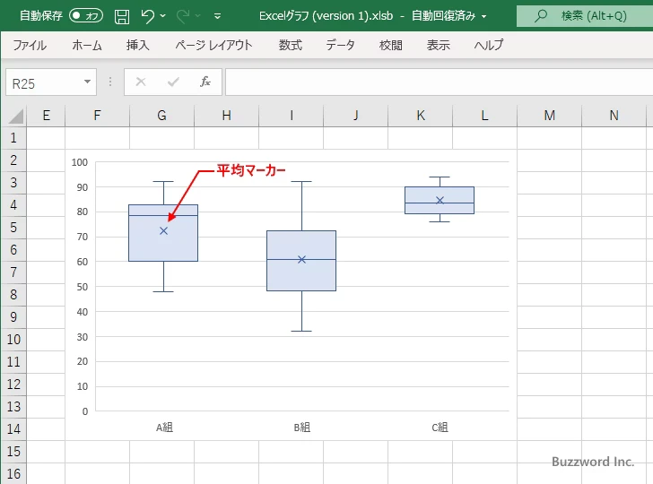 なお「平均マーカーを表示する」と「平均線を表示」にチェックをすることで、各グループの平均マーカーを結ぶ線を箱ひげ図上に表示することができます。