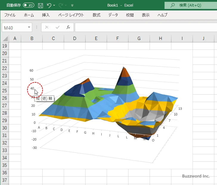 等高線グラフは縦軸の目盛線の間隔で色が塗り分けられます。下記では目盛間隔が 10 に設定されているため、高さが 10 毎に異なる色で塗り分けられています。