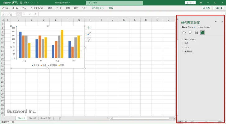 画面右側に「軸の書式設定」を行うエリアが表示されます。