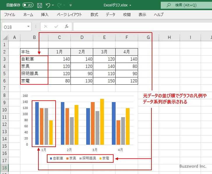 Excel のグラフ上で表示される凡例およびデータ系列の順番を変更する手順について解説しました。