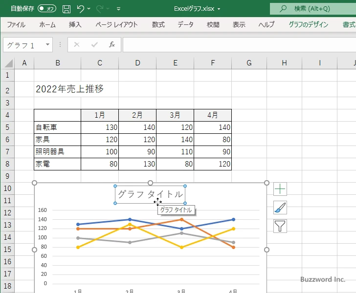 グラフを作成するとグラフタイトルが表示されます。デフォルトでは「グラフタイトル」と表示されていますが、任意の文字列に編集することができます。(グラフのタイトルを編集する方法は「タイトルの編集と表示/非表示の切り替え」を参照されてください)。