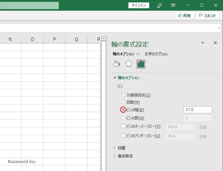 区間を設定するには「軸のオプション」の中の「ビン」の部分で行います。