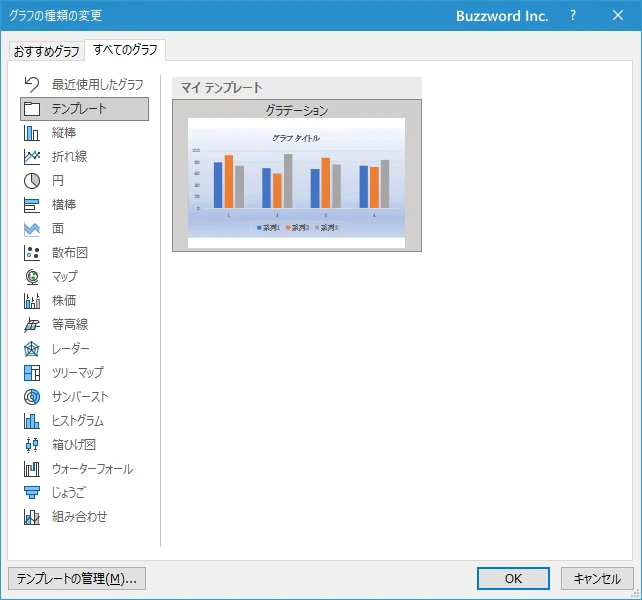 保存してあるテンプレートを削除するには、テンプレートとして保存したファイルを削除します。保存してあるファイルの場所が分からない場合は、先ほどと同じ手順で「グラフの挿入」ダイアログを表示したあとで「テンプレート」を表示してください。