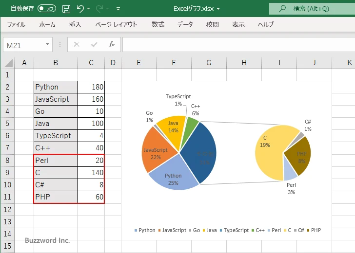 メインの円グラフに表示されている「JavaScript」を補助円グラフの方で表示するように変更してみます。まず対象の扇形を一度クリックしてください。グラフ全体が選択された状態になります。