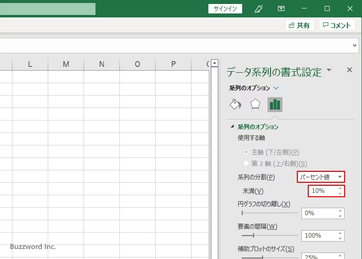 3 番目の方法は「パーセント値」で指定する方法です。グラフの元データの中で、指定したパーセント値よりも小さい値の項目が補助円グラフに表示されます。「系列の分割」で「パーセント値」を選択したあと、「未満」の右側に基準となるパーセント値を指定してください。
