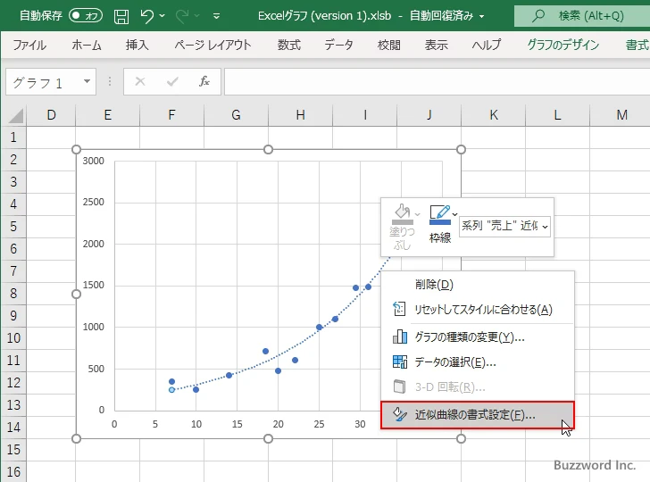 近似曲線の上で右クリックし、表示されたメニューの中から「近似曲線の書式設定」をクリックしてください。