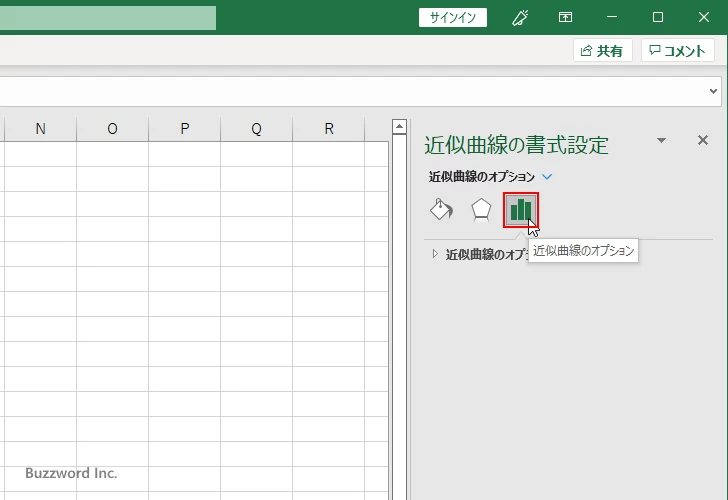 画面右側に「近似曲線の書式設定」を設定する画面が表示されます。「近似曲線のオプション」アイコンをクリックしてください。