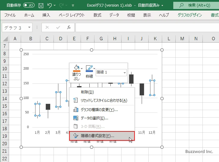 陽線の上で右クリックし、表示されたメニューの中から「陽線の書式設定」をクリックしてください。