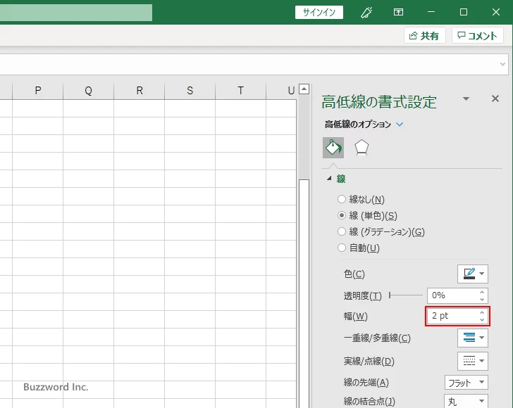 陽線または陰線の上ヒゲや下ヒゲの色や幅を設定する方法です。 Excel 上では高低線という名前になります。下記では陽線を例に設定方法を確認しますが、陰線の場合も同じ手順となります。