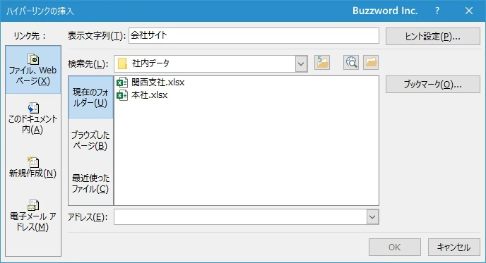 「ハイパーリンクの挿入」ダイアログが表示されます。