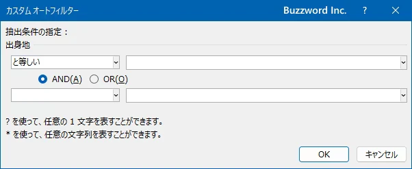 例えばサブメニューから「指定の値に等しい」をクリックすると次のような「カスタムオートフィルター」ダイアログが表示されます。