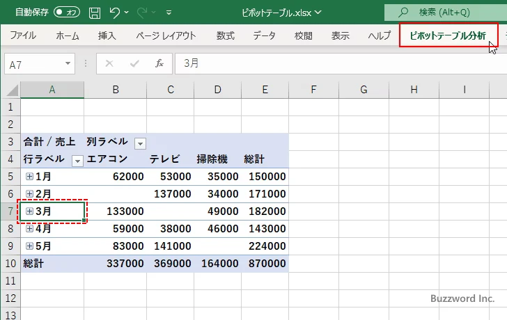この場合、日付データは「月」単位で自動的にグループ化されて月単位で集計が行われたピボットテーブルが作成されます。