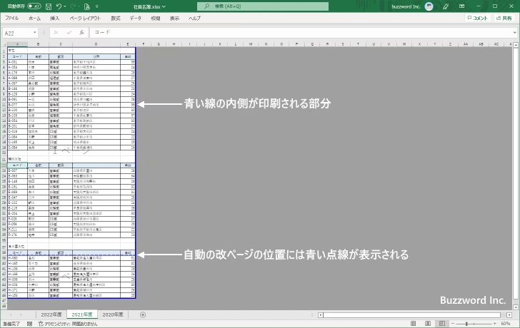今回は上の方へドラッグしました。ドロップした位置に改ページの位置が変更されます。自動の改ページの位置を移動すると、手動で改ページを設定した場合と同じく青い点線から青い線に変わります。
