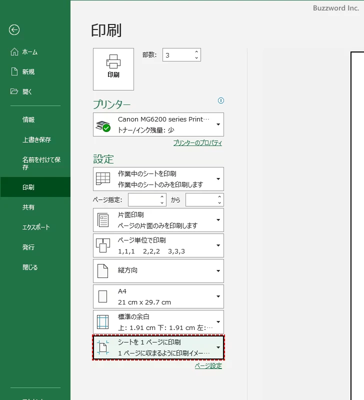 印刷プレビューも全体が 1 ページに入るように縮小された状態で表示されます。