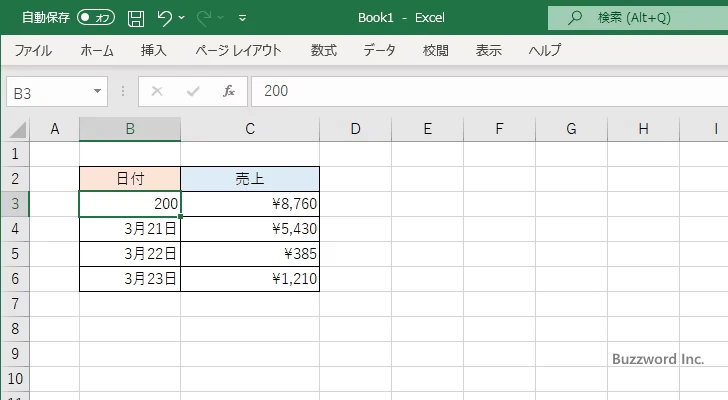 B3 セルから B6 セルには日付が入力されているため、表示形式として「日付」が設定されています。例えばあとから B3 セルに 200 のような数値を入力してみます。