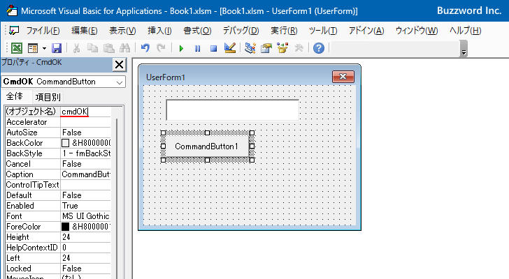 テキストボックスのオブジェクト名は「TextBox1」、コマンドボタンのオブジェクト名は「CommandButton1」になっていることが確認できます。