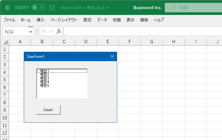 ユーザーフォームを表示すると、リストボックスが表示されます。リストボックスには 5 個の項目が追加されています。