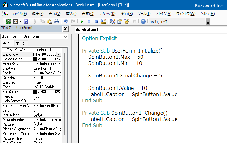 具体的には次のように記述します。下記ではユーザーフォームが表示される前に発生する Initialize イベントに対するイベントプロシージャにコードを記述し、スピンボタンをクリックしたときの変化量を設定しています。またスピンボタンの初期値も設定しています。