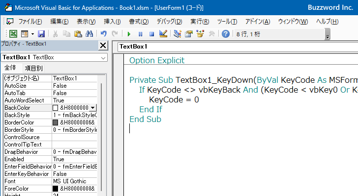 テキストボックスに対する KeyDown イベントのイベントプロシージャの中で、入力されたキーのキーコードを調べ、数字の 0 から 9 の文字のキー、または BackSpace キー以外のキーが押された場合はキーの入力を無効にします。( Excel では文字毎のキーコードを定数で定義しており、その定数と比較しています。定数の一覧はこのページの最後に記載しています)。