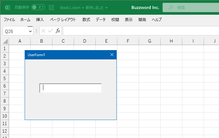 それでは簡単なサンプルで試してみます。ユーザーフォームにテキストボックスを設置しました。