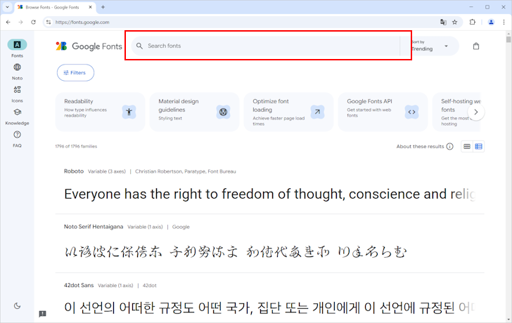 例えば Noto と検索すると、フォント名に Noto が含まれるフォントの一覧が表示されます。