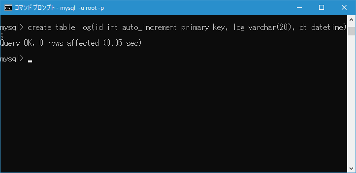 create table log(id int auto_increment primary key, log varchar(20), dt datetime);