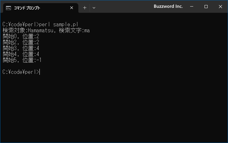 use strict; use warnings; use utf8; binmode STDIN, ':encoding(cp932)'; binmode STDOUT, ':encoding(cp932)'; binmode STDERR, ':encoding(cp932)'; my $target = "Hamamatsu"; print "検索対象:$target, 検索文字:ma\n"; my $pos; $pos = index($target, "ma"); print "開始0, 位置:$pos\n"; $pos = index($target, "ma", 2); print "開始2, 位置:$pos\n"; $pos = index($target, "ma", 3); print "開始3, 位置:$pos\n"; $pos = index($target, "ma", 4); print "開始4, 位置:$pos\n"; $pos = index($target, "ma", 5); print "開始5, 位置:$pos\n";