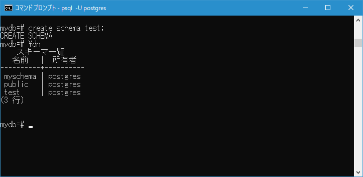 新しいスキーマが作成されました。確認のためにあらためて \dn コマンドを実行します。
