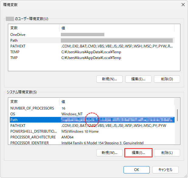 システム環境変数の中で「変数」が「Path」と書かれたものを探してください。見つかった場合には「Path」と書かれた箇所を一度クリックして選択してから「編集」ボタンをクリックして下さい。