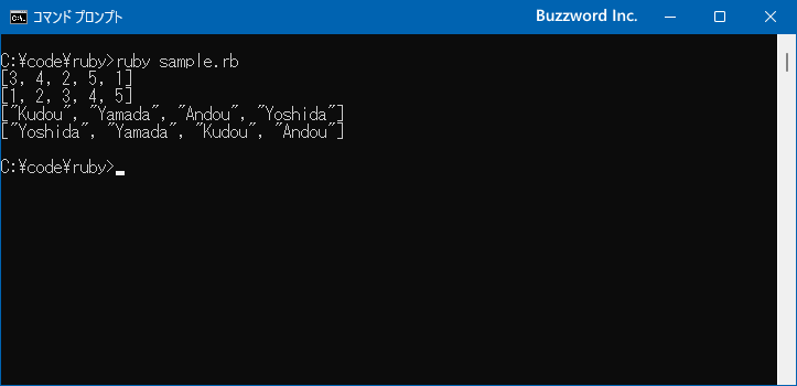 ソートは比較方式を指定しない場合には各要素を <=> メソッドで要素と要素を比較します。この場合、要素は小さい順番に並べ替えられます。
