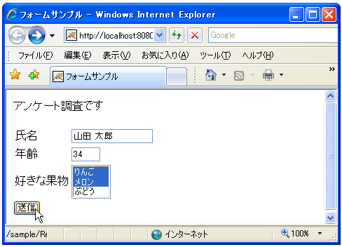<!DOCTYPE html PUBLIC "-//W3C//DTD HTML 4.01//EN" "http://www.w3.org/TR/html4/strict.dtd"> <html lang="ja"> <head> <meta http-equiv="Content-Type" Content="text/html;charset=Shift_JIS"> <title>フォームサンプル</title> </head> <body> <p>アンケート調査です</p> <form action="/sample/RequestSample3" method="post"> <table> <tr> <td>氏名</td> <td><input type="text" size="20" value="" name="name"></td> </tr> <tr> <td>年齢</td> <td><input type="text" size="5" value="" name="old"></td> </tr> <tr> <td>好きな果物</td> <td> <select name="food" size="3" multiple> <option value="りんご">りんご</option> <option value="メロン">メロン</option> <option value="ぶどう">ぶどう</option> </select> </td> </tr> </table> <input type="submit" name="button1" value="送信"> </form> </body> </html>