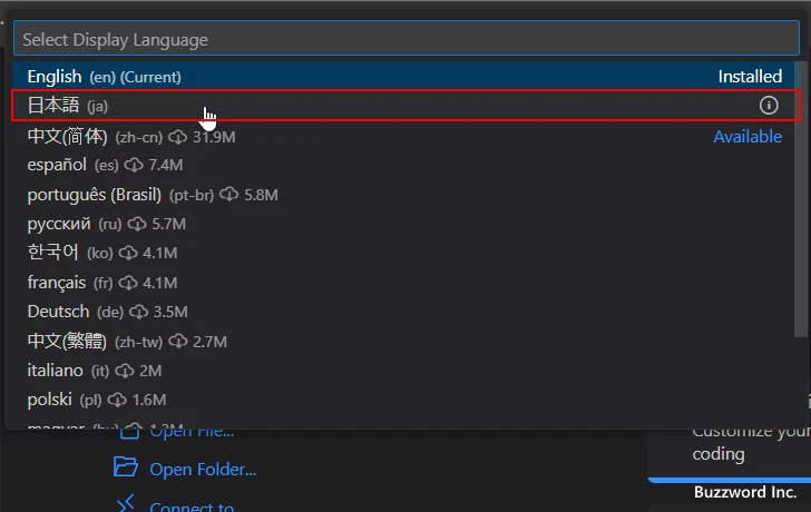 なお普段使用する言語を変更したわけではないので、次回 Visual Studio Code を特に言語を指定せずに起動すると、元々使用するように設定されていた言語を使って起動します。