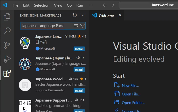 Extensions の検索ボックスが表示されるので、「Japanese Language Pack」と検索してください。