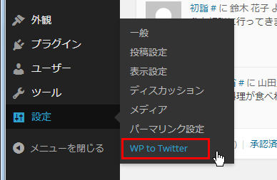 管理画面の「設定」メニューの中の「WP to Twitter」メニューをクリックして下さい。