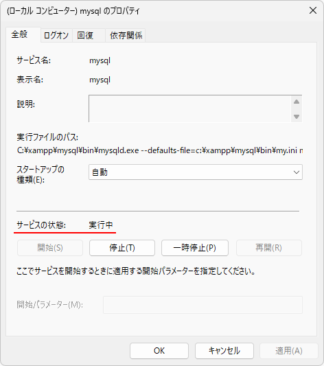 現在は「停止」となっており MariaDB は起動していません。「スタートアップの種類」を「自動」に設定しましたので、次に Windows を起動すればアプリケーションは自動的に起動します。今すぐに起動させたい場合には「開始」ボタンをクリックして下さい。